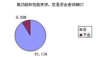 題8的調(diào)查結果對于中國移動來講絕對是充滿誘惑的,高達91.11%的被訪者表示他們非常愿意嘗試MMS的功能和服務,無疑這對ICP們(MMS服務的重要載體)也是一針強心劑。