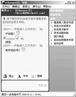 聊天功能是IM軟件最基本、也是最重要的功能,基本上每一種IM軟件在這個功能上的操作都差不多:如果用戶想與聯(lián)系人進行聊天,可以雙擊IM中聯(lián)系人的頭像,在彈出的對話框中敲入文字信息發(fā)送即可。QQ的特點是可以給不在線的朋友發(fā)送信息,對方下次上線的時候可以收到,MSN雖然不具備這樣的功能,但是它在聊天過程中可以使用各種漂亮的表情圖標(biāo)為聊天添加了不少情趣。