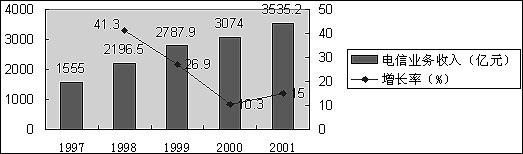 圖1,1997-2001 年我國(guó)電信業(yè)務(wù)總量與電信收入的發(fā)展?fàn)顩r(單位:億元)。