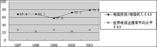 由于電信收入無法實(shí)現(xiàn)高增長(zhǎng),我國(guó)電信運(yùn)營(yíng)商如果繼續(xù)連續(xù)進(jìn)行大規(guī)模投資,將無法收回投資。我國(guó)電信運(yùn)營(yíng)業(yè)的投資一直保持在高水平,2000年度我國(guó)電信投資占到電信收入的72.3 %,而世界平均水平為21.9 %。在2001年度,我國(guó)電信投資/電信收入的比例高達(dá)78.6 %(依據(jù)CCID數(shù)據(jù)),這樣高的投資比例是不可能維持的。