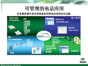 Sonus IP CENTREX解決方案主要基于可管理的語音數(shù)據綜合寬帶接入網;能夠提供話音業(yè)務的應用交換機;能夠提供桌面話音業(yè)務的IP