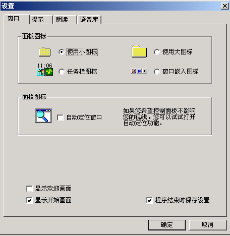 如果需要進一步的調(diào)整,可以選擇菜單里的“設置……”。打開設置窗口(如圖3)。窗口共分四個選項,每個選項里除了剛介紹的幾種常用功能調(diào)整外,還可以控制歡迎畫面、開始畫面、設定存儲等功能,規(guī)定提示速度、朗讀速度的快慢,選擇提示方式,設定提示報警條件。在“語音庫”選項中還可以選擇朗讀為男聲還是女聲。單擊“設置”按鈕,可以根據(jù)具體需要選擇“鍵盤”或“中文”里被朗讀標點符號的種類(如圖4)。