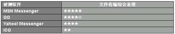 評測傳輸結(jié)果表明,MSN Messenger 6.0穿防火墻的能力很強,而且傳輸速度還不錯;QQ的速度與MSN Messenger相當(dāng),但防火墻穿越能力和傳輸穩(wěn)定性上略遜一籌;Yahoo! Messenger對50M的文件好像有點消化不良;ICQ的傳輸成功率幾乎為20%,成功后效果也不盡如人意。