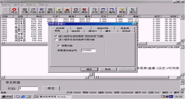常規(guī)設置有可選擇<進入程序后自動選擇"啟動發(fā)送"功能>、<進入程序后自動選擇行情功能>、<報警功能>及報警通知地址碼的設置。啟動報警功能后,當信息源中斷時系統(tǒng)就會發(fā)出報警通知。