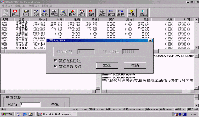 選擇<代碼>按鈕進行證券代碼發(fā)布,系統(tǒng)自動彈出<代碼發(fā)送窗口>,如圖3.3