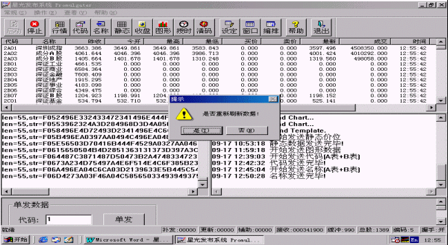 行情也可以單發(fā),只要在進行證券信息發(fā)布時在程序主界面的下方<單發(fā)數(shù)據(jù)>區(qū)輸入要單發(fā)的股票代碼,然后點擊<單發(fā)>按鈕,系統(tǒng)就會盡快刷新該只股票。