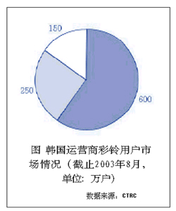 彩鈴業(yè)務(wù)最先是由韓國的SK電信于2002年3月推出的,業(yè)務(wù)一經(jīng)面世就吸引了移動(dòng)用戶、特別是年青用戶群體的眼球,開通的用戶數(shù)和業(yè)務(wù)使用率呈指數(shù)式增長;同時(shí)由彩鈴業(yè)務(wù)帶來的互聯(lián)網(wǎng)、WAP和IVR的話務(wù)量的增長進(jìn)一步提升了彩鈴業(yè)務(wù)的含金量。隨后韓國的其他兩個(gè)移動(dòng)運(yùn)營商LG電信和韓國電信也分別于2002年6月和9月相繼開通彩鈴業(yè)務(wù)。經(jīng)過運(yùn)營商和彩鈴的內(nèi)容提供商的前期市場(chǎng)推廣和運(yùn)作,目前已發(fā)展了近1000萬用戶,其中運(yùn)營商的市場(chǎng)份額如圖所示。