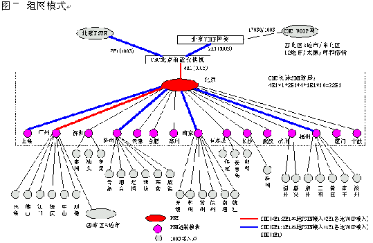 網(wǎng)通的客戶服務(wù)系統(tǒng)(1003呼叫中心)包括位于北京總部的總中心及其它全國30多個城市的分中心,全國范圍共有近200個接入點(覆蓋城市),共有200余座席,由總中心,交換機遠端模塊接入點子中心及軟覆蓋接入點組成的三層架構(gòu)。參見下圖一《系統(tǒng)架構(gòu)》及圖二《組網(wǎng)模式》。