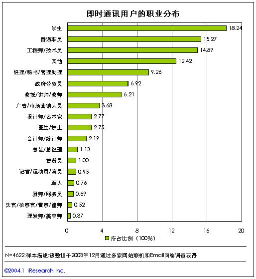 從即時(shí)通訊用戶的職業(yè)結(jié)構(gòu)來看,在中國的即時(shí)通訊用戶中,學(xué)生、普通公司職員、工程技術(shù)人員構(gòu)成了最主要的用戶群體,其中學(xué)生的比例最高,達(dá)到了18.24%?撮_學(xué)生是中國即時(shí)通訊的生力軍。