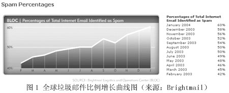 圖1來自著名的反垃圾郵件先鋒Brightmail公司的網(wǎng)站,顯示了最近12個(gè)月來,全球范圍內(nèi)垃圾郵件在所有郵件中所占比例的增長曲線圖。按Brightmail的統(tǒng)計(jì)結(jié)果,2003年3月,垃圾郵件在全球郵件總量中的比例是45%,其后的一年間,平均每個(gè)月增長兩個(gè)百分點(diǎn)。到了今年2月,這個(gè)比例已經(jīng)達(dá)到62%,也就是說,現(xiàn)在全球每5封電子郵件中就有3封是有害無益的垃圾郵件。
