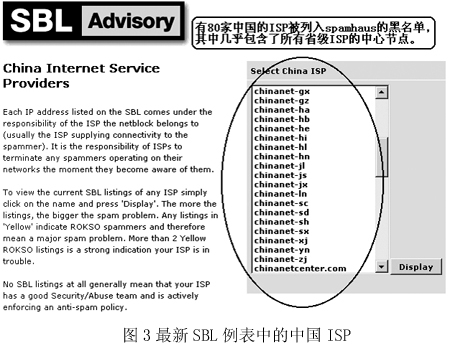 垃圾郵件損害的不只是中國的國際形象,中國反垃圾郵件聯(lián)盟的葉豪告訴記者,類似SBL(更一般的是RBL,即“實(shí)時(shí)黑名單”)這樣的服務(wù)是由國外的一些公司或第三方組織提供的,目前已經(jīng)成為國際上比較通行的防范垃圾郵件的措施。而在具備較高知名度的Spamhaus所維護(hù)的這份黑名單中,我國的ISP竟然多達(dá)80家(如圖3),幾乎所有的省級(jí)ISP都位列其中!爸袊芏啻蟮腎SP都在不同的‘黑名單’里,從這些國內(nèi)ISP發(fā)出的郵件,那些用‘黑名單’的客戶根本就收不到。現(xiàn)在‘黑名單’是比較好用的一種辦法,所以使用‘黑名單’服務(wù)的企業(yè)也越來越多,國際上針對(duì)中國的信息壁壘就越來越厲害,再不采取措施,中國就等著被全世界‘封掉’吧!”