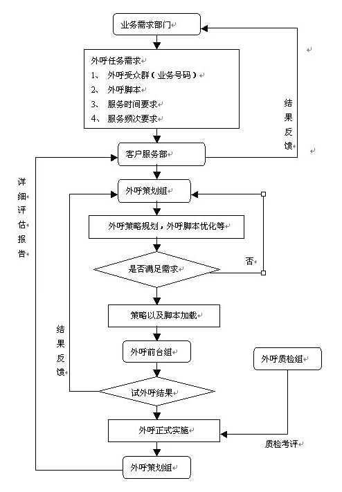 。。外呼業(yè)務(wù)數(shù)據(jù)(外呼業(yè)務(wù)需求書(shū))由需求部門提出,以業(yè)務(wù)聯(lián)系單的形式,發(fā)往客戶服務(wù)部。外呼業(yè)務(wù)需求書(shū)應(yīng)包括需要進(jìn)行外呼的目標(biāo)用戶,包括明確的外呼業(yè)務(wù)腳本,應(yīng)給出明確的完成時(shí)間要求,以及外呼時(shí)點(diǎn)(如:是白天、夜晚、節(jié)假日等),如果外呼不成功,需重復(fù)的頻次等。