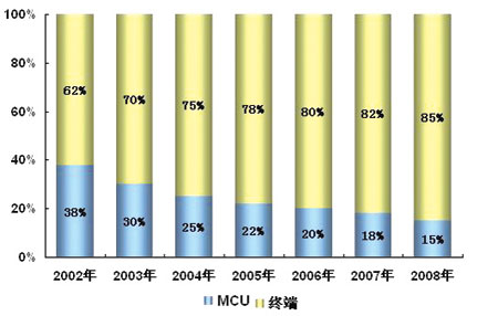 一般來說,終端和MCU是視頻會(huì)議系統(tǒng)產(chǎn)品最為關(guān)鍵的部分。計(jì)世資訊(CCW Research)的研究表明:近年來,終端的銷售比例持續(xù)增長,而MCU的銷售比例則相應(yīng)萎縮。2005年,終端和MCU的比例分別為78.0%和22.0%。