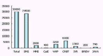 2005年,中國(guó)的移動(dòng)增值業(yè)務(wù)用戶規(guī)?倲(shù)達(dá)到了3億,其中短信用戶伴隨移動(dòng)通信用戶的穩(wěn)定增長(zhǎng)而增長(zhǎng),MMS、CaiE、JAVA、BREW等數(shù)據(jù)業(yè)務(wù)隨著終端的普及以及產(chǎn)品的豐富,增長(zhǎng)很快,以上四類(lèi)數(shù)據(jù)增值業(yè)務(wù)累計(jì)用戶2005年已超過(guò)2500萬(wàn)。