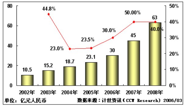 計世資訊(CCW Research)預(yù)測認(rèn)為,2006年和2007年視頻會議市場將以30%和50%的增長率飛速增長。市場規(guī)模分別達到30億和45億人民幣。而2008年隨著奧運建設(shè)的告一段落,整個市場將進入一個消化調(diào)整期,市場發(fā)展速度則逐步開始放慢。