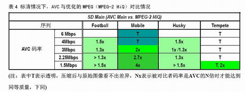 由表可以看出,AVC與優(yōu)化的MPEG-2高清編碼器比,9個(gè)可比項(xiàng)中有7個(gè)的N大于等于1.7,有3個(gè)大于等于2,有一個(gè)等于3.3。