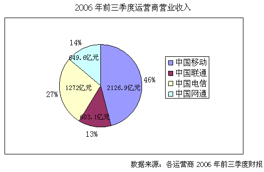 近日,四大運營商紛紛公布2006年前三季度的財務報表,截止9月底中國移動營運收入達到2126.91億元,比上年同期增長20.8%,遠遠高于競爭對手中國聯(lián)通的營業(yè)收入增長5.6%,而固網運營商中國電信和中國網通的收入增長更低,僅為4.5%和2.03%。透過這些數(shù)字,我們看到的是運營商實力差距的進一步拉大。