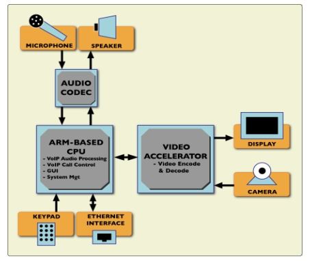 如果通過代碼匯編和手動(dòng)軟件優(yōu)化,VoIP編解碼器(G.711、G.729AB、G.723.1、iLBC)、音頻處理(DTMF以及通話進(jìn)行音調(diào)檢測(cè)/產(chǎn)生)語音質(zhì)量增強(qiáng)(線路和聲學(xué)回聲消除和抖動(dòng)緩沖等)以及其他相似的功能現(xiàn)在都能有效地在應(yīng)用處理器上實(shí)現(xiàn)。越來越多的應(yīng)用處理器集成了硬件加速功能,我們可以利用硬件加速來處理視頻編碼和解碼(見圖2)。