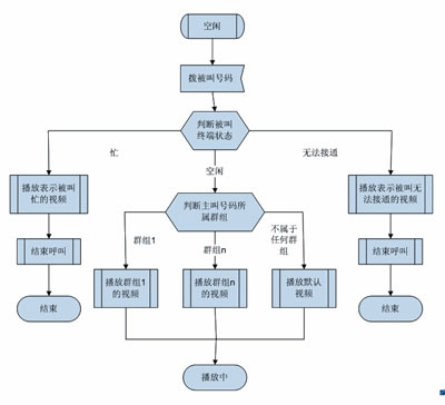 多媒體彩鈴用戶可以為某一位或某一組主叫用戶設(shè)定不同的視頻,當(dāng)某個主叫用戶來電時,系統(tǒng)根據(jù)被叫用戶的狀態(tài)和主叫所屬的群組播放不同的視頻。如果被叫忙或者無法接通,則播放能表達(dá)被叫當(dāng)前狀態(tài)的默認(rèn)系統(tǒng)視頻;如果被叫空閑,則根據(jù)主叫號碼所屬的群組播放被叫為該群組定制的視頻。無論在哪種情況下,主叫都可以在手機(jī)上欣賞到精彩的視頻媒體。圖1是多媒體彩鈴業(yè)務(wù)使用流程。