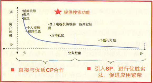 增值業(yè)務(wù)內(nèi)容定位可參考長尾理論模型。長尾理論的頭部通常是大眾市場,要求產(chǎn)品滿足用戶符號(hào)化的需求,主流業(yè)務(wù)將具備更廣的流行效應(yīng),如新聞、游戲和音樂,頭部的業(yè)務(wù)往往能夠滿足大規(guī)模用戶需求,提供優(yōu)質(zhì)業(yè)務(wù)體驗(yàn);尾部通常是細(xì)分市場和互動(dòng)市場,要求業(yè)務(wù)滿足生產(chǎn)與消費(fèi)一體化的需求,體現(xiàn)交互性,為用戶帶來整合的、一對(duì)一的體驗(yàn),以促進(jìn)IPTV應(yīng)用繁榮。