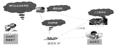 步驟五:如果用戶不知道員工分機(jī)號碼或者希望了解其他信息,主叫用戶可以選擇接入人工秘書臺。此時(shí)人工秘書臺會依據(jù)被叫號碼檢索出被呼叫集團(tuán)的信息,同時(shí)根據(jù)主叫號碼檢索出主叫用戶是否為企業(yè)內(nèi)部員工或者企業(yè)客戶,同時(shí)將這些信息同步更新到人工秘書臺上,話務(wù)員根據(jù)這些信息可以完成作為企業(yè)特色話務(wù)員的服務(wù)工作;