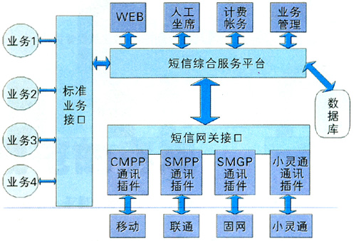 業(yè)務(wù)管理平臺是為運(yùn)營商提供的可快速啟動各種數(shù)據(jù)業(yè)務(wù)的平臺,具有強(qiáng)大的資源調(diào)度能力。它連接運(yùn)營商的基礎(chǔ)網(wǎng)絡(luò)和業(yè)務(wù)支撐系統(tǒng)(客服系統(tǒng)、計費(fèi)系統(tǒng)),為服務(wù)提供商/內(nèi)容提供商們提供各種移動資源(如短信息中心資源、用戶信息資源、語音資源等)、功能資源(如單點(diǎn)認(rèn)證、計費(fèi)、漫游控制等)及各種公共的資源引擎(如地理位置、語音交互、推送信息等)。業(yè)務(wù)支撐系統(tǒng)是運(yùn)營商為了開展業(yè)務(wù)必須建設(shè)的客服系統(tǒng)、營業(yè)系統(tǒng)、計費(fèi)系統(tǒng)等子系統(tǒng)。圖3是目前常用的綜合短信平臺[3]。