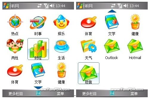 用戶登錄后會(huì)進(jìn)入聽(tīng)網(wǎng)軟件的“頻道面板”,這是“移動(dòng)聽(tīng)網(wǎng)”軟件的主界面,看上去相當(dāng)華麗,整合了豐富多彩的熱點(diǎn)信息,這里面的小圖標(biāo)分別代表熱點(diǎn)、時(shí)事、娛樂(lè)、兩性、財(cái)經(jīng)、生活、體育、文學(xué)、健康、天氣,除此之外,還集成了短信項(xiàng),根據(jù)用戶的設(shè)置還可以有Outlook和Hotmail,幾乎涵蓋了所有內(nèi)容,滿足了不同人群的需求。
