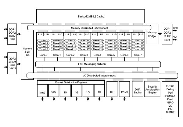 今年以來(lái),RISC多核處理器在網(wǎng)絡(luò)設(shè)備的應(yīng)用加速,我們注意到另一家智能網(wǎng)絡(luò)用多核處理器供應(yīng)商Cavium Networks公司也宣布推出了多核網(wǎng)絡(luò)處理器OCTEON產(chǎn)品系列,該系列由1到16個(gè)基于MIPS64技術(shù)的cnMIPS內(nèi)核構(gòu)成,能夠在單一芯片上提供高達(dá)16GHz的64位計(jì)算處理能力。此外,OCTEON還采用了最先進(jìn)的多層次應(yīng)用加速技術(shù),用于支持網(wǎng)絡(luò)控制、數(shù)據(jù)和服務(wù)應(yīng)用等。OCTEON處理器產(chǎn)品系列集成了多達(dá)8個(gè)Gigabit端口、雙SPI-4.2、PCI-X、高達(dá)144-bit的DDR2控制器、雙8-bit