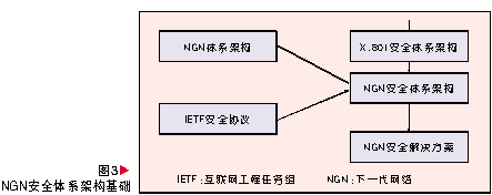 “Security Consideration”章節(jié)。本文對NGN安全基礎(chǔ)[6-8]、 NGN安全需求[2-9]、安全體系架構(gòu)[10-14]、安全機(jī)制[15-17]進(jìn)行了研究,為我國NGN的研究和部署提供有益的參考。