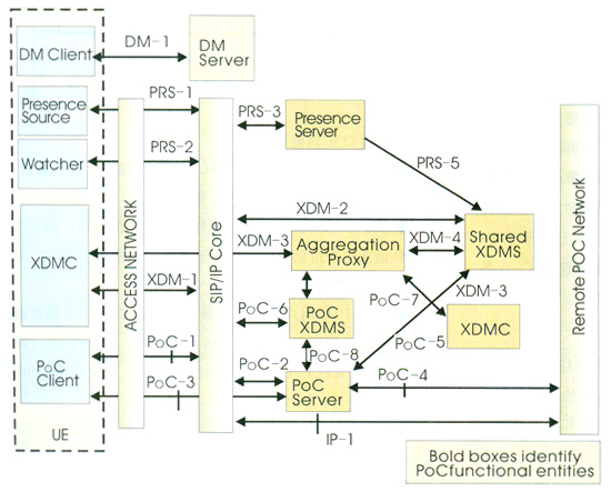 PoC業(yè)務(wù)需要外部實(shí)體配合提供,包括SIP/IP核心、共享XML文檔管理服務(wù)器(共享XDMS)、匯聚代理、在席服務(wù)器、在席信息源、觀察者、計(jì)費(fèi)實(shí)體和設(shè)備管理等,其中主要有: