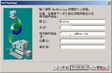 首次運行Netmeeting,軟件會出現(xiàn)一個向導,要求對用戶信息進行簡單的設定,單擊下一步,輸入個人信息,如圖4所示: