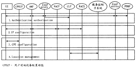 AMF負(fù)責(zé)翻譯UE的接入請(qǐng)求,將UE的IP地址分配請(qǐng)求以及網(wǎng)絡(luò)配置參數(shù)請(qǐng)求轉(zhuǎn)發(fā)至NACF,將用戶鑒權(quán)請(qǐng)求轉(zhuǎn)發(fā)給用戶接入鑒權(quán)功能(UAAF),反向則將來自NACF或UAAF的響應(yīng)轉(zhuǎn)發(fā)給UE。