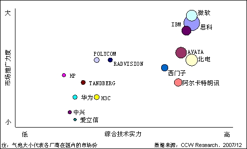 市場競爭非常激烈,但還沒有一個廠商占據(jù)對優(yōu)勢。目前統(tǒng)一通信市場形成了兩類供應商的競爭:電信網(wǎng)絡設備廠商(如思科、北電)和軟件廠商(如微軟、IBM)。電信設備廠商的優(yōu)勢集中在硬件產(chǎn)品上,比如路由器、VoIP網(wǎng)關產(chǎn)品、軟交換設備;而軟件廠商,像微軟、IBM的優(yōu)勢在于其在電腦桌面上的絕對統(tǒng)治力,幾乎所有的統(tǒng)一通信企業(yè)都需要和微軟、IBM進行合作。但從現(xiàn)在的發(fā)展狀況來看,各類廠商之間既有競爭又有合作,但還沒有一個廠商占據(jù)對優(yōu)勢。