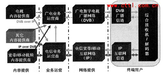 DVB技術(shù)通過廣電業(yè)務運營商來開展IPTV業(yè)務。由于廣電的業(yè)務通道是單向的,需要找到一條回路才能開展IPTV業(yè)務。這條回路既可以借助電信的業(yè)務通道來實現(xiàn),也可以再重新鋪設一條回路(盡管再重新鋪設一條回路會由于從技術(shù)和經(jīng)費上都需要巨大投入而使雙向改造實現(xiàn)起來十分困難,并且這種改造的投入和產(chǎn)出之間可能會產(chǎn)生相當大的差距,雖然可行性不大,但這畢竟是一種可以實現(xiàn)的解決方案)。