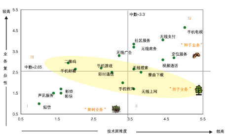 根據(jù)“業(yè)務(wù)復(fù)雜性—技術(shù)困難度”模型,可以清晰地看到一個(gè)業(yè)務(wù)的成功商用和業(yè)務(wù)復(fù)雜性與技術(shù)困難度密切相關(guān),如短信和彩鈴等復(fù)雜性與技術(shù)困難度都很低的業(yè)務(wù)是比較容易成功商用的,將這一類業(yè)務(wù)歸類為“果樹業(yè)務(wù)”,在第一象限(象限I)。還有一些業(yè)務(wù)如即時(shí)通信、整曲下載和無線搜索等業(yè)務(wù),已經(jīng)開始快速增長(zhǎng)但是其用戶規(guī)模和收入量都還低于“果樹業(yè)務(wù)”,在業(yè)務(wù)復(fù)雜性與技術(shù)困難度坐標(biāo)中這類業(yè)務(wù)處于4個(gè)象限交匯的中部區(qū)域(即圖中黃色區(qū)域),由于業(yè)務(wù)復(fù)雜性和技術(shù)困難度都會(huì)隨時(shí)間而減小,從而這一區(qū)域的業(yè)務(wù)會(huì)向第一象限演進(jìn),這類業(yè)務(wù)稱為“苗子業(yè)務(wù)”,即在3年內(nèi)能夠成熟的業(yè)務(wù)。在坐標(biāo)系的右上角第四象限,即業(yè)務(wù)復(fù)雜性和技術(shù)困難度均較高的業(yè)務(wù),稱之為“種子業(yè)務(wù)”,這類業(yè)務(wù)在短期內(nèi)很難快速成長(zhǎng)。