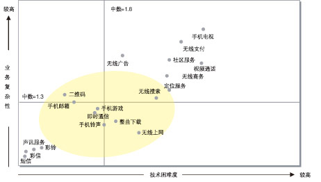 諾基亞西門子通信借鑒國(guó)外的無限增值業(yè)務(wù)經(jīng)驗(yàn)和對(duì)國(guó)內(nèi)運(yùn)營(yíng)商業(yè)務(wù)的分析提出“技術(shù)困難度—業(yè)務(wù)復(fù)雜性”模型來詮釋無線增值業(yè)務(wù)。