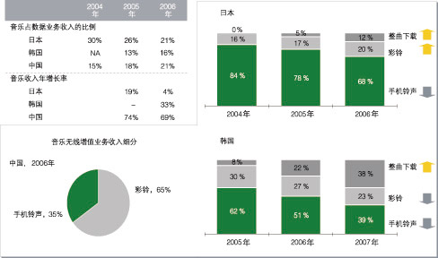圖3 無線音樂業(yè)務(wù)在日本、韓國(guó)和中國(guó)的發(fā)展情況