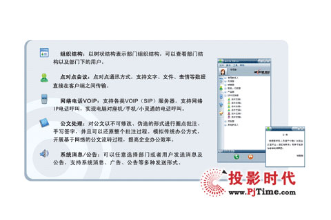 Center運(yùn)營架構(gòu)為基礎(chǔ),有效整合了企業(yè)的如電話、傳真、手機(jī)、短信、E-mail、即時(shí)通訊等各種常用的通信設(shè)備和媒體應(yīng)用,并進(jìn)行統(tǒng)一管理、計(jì)劃及協(xié)同,是一套集即時(shí)通訊、網(wǎng)絡(luò)電話、點(diǎn)對點(diǎn)會(huì)議、多方視頻會(huì)議、遠(yuǎn)程教學(xué)、遠(yuǎn)程監(jiān)控、組織結(jié)構(gòu)等為一體的桌面融合辦公系統(tǒng),能夠全面滿足企業(yè)遠(yuǎn)程的日常交流、會(huì)議培訓(xùn)、協(xié)同辦公、商務(wù)談判、指揮調(diào)度、安全保衛(wèi)等各種需求。