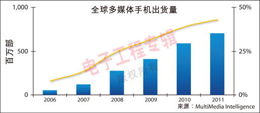 圖1:全球多媒體手機交貨量及占總數(shù)量的百分比