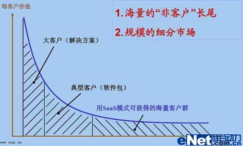 SaaS模式就是不論是什么樣的客戶都向其提供服務(wù),不論服務(wù)的時(shí)間長(zhǎng)短,不論身處何地。傳統(tǒng)軟件是很難適應(yīng)普通客戶的,普通客戶付不出更多的投資,也不想軟件、硬件、服務(wù)都全面去投資,這樣就只有放棄使用軟件了。自然,軟件市場(chǎng)就少了一大群消費(fèi)者。而SaaS模式將不細(xì)分客戶類型,讓人人都可使用軟件,讓個(gè)個(gè)都消費(fèi)得起軟件。可想而知,這是一個(gè)怎么龐大的市場(chǎng)。如下圖所示: