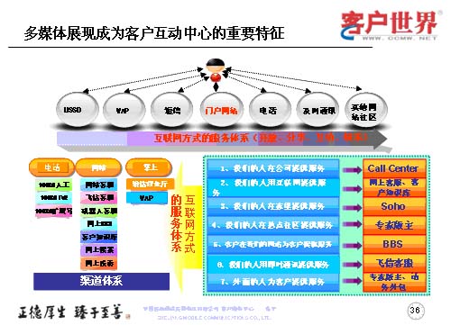 世界上卓越的企業(yè)無所不在,在客戶戰(zhàn)略上最具創(chuàng)新能力的企業(yè),奠定起的競爭,也會越來越出體現(xiàn)在客戶關(guān)系管理上,隨著數(shù)據(jù)業(yè)務(wù)成為運(yùn)營商的主流業(yè)務(wù),呼叫中心在服務(wù)、營銷、渠道管理等方面的戰(zhàn)略地位會日益重要,隨著客戶接觸的不斷增長,呼叫中心將逐漸演變成客戶接觸中心、互動中心,乃至包括實體渠道之外的各種電子渠道,任重而道遠(yuǎn)。