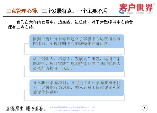 在這六年中,我們有三點(diǎn)管理心得,三個發(fā)展特點(diǎn),一個主要矛盾。我們邊實踐邊總結(jié),對大型呼叫中心運(yùn)營的管理有三點(diǎn)心得: