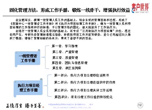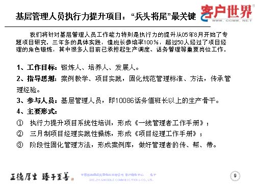 大家知道基層管理人員其實是兵頭將尾的最關(guān)鍵,我們將對基層管理人員的工作能力,特別是執(zhí)行力的提升是從05年8月份就開始了專項研究,三年多的具體實踐,值班長的培訓(xùn)率達(dá)到100%,超過50人經(jīng)過了項目經(jīng)理的角色鍛煉,目前很多擔(dān)任過項目經(jīng)理的已經(jīng)承擔(dān)了生產(chǎn)調(diào)度、話務(wù)管理等重要的管理崗位。在這個項目當(dāng)中,我們從四個方面入手,工作目標(biāo)是鍛煉人、培養(yǎng)人、發(fā)展人。指導(dǎo)思想是案例教育、項目實踐,固化規(guī)范管理標(biāo)準(zhǔn)、方法,傳承管理經(jīng)驗。參與人員就是基層管理人員,話務(wù)值班長以上的生產(chǎn)骨干。我們主要運(yùn)用的形式是執(zhí)行力提升項目系統(tǒng)培訓(xùn),形成了《一線管理者工作手冊》。三月制項目經(jīng)理的實踐操練,通過競聘的方式產(chǎn)生,形成了《項目經(jīng)理工作手冊》。階段性的固化-優(yōu)化-再固化的管理方法,形成案例庫,做好管理者的傳幫帶。