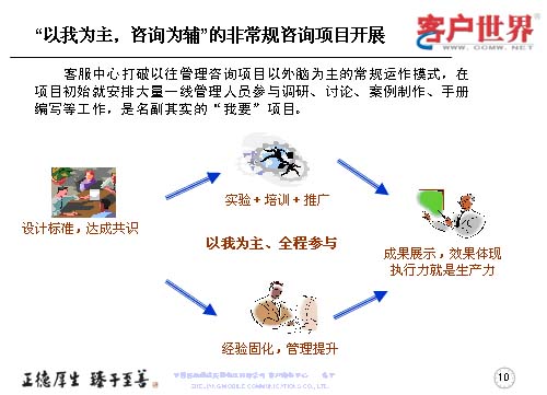 這個管理咨詢項目開展中,是以我為主,咨詢?yōu)檩o的非常規(guī)咨詢項目,打破的是以外腦為主的常規(guī)運(yùn)作模式,在項目初期就有大量的一線管理人員參與調(diào)研、討論、案例制作、手冊編制,是名副其實的“我要”項目。那么在這個方面我們分成了三部曲,設(shè)計標(biāo)準(zhǔn)、達(dá)成共識,通過實驗加培訓(xùn)推廣,以我為主的全程參與,來固化經(jīng)驗,提升管理。最后成果展示,效果體現(xiàn)于執(zhí)行力,彰顯出生產(chǎn)力。