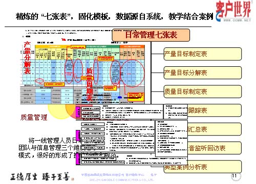 我們精煉了這么七張表的方式,運(yùn)用三個維度:產(chǎn)量管理、質(zhì)量管理和團(tuán)隊與信息管理,而這些基礎(chǔ)數(shù)據(jù)都來自于系統(tǒng),教學(xué)和案例。而七張表是從產(chǎn)量、質(zhì)量和團(tuán)隊信息來展現(xiàn)出具體的一些應(yīng)用,將一線管理人員從日常工作的三個維度入手,形成七張表管理模式,很好地具備了操作標(biāo)準(zhǔn)和規(guī)范。這模板表除了系統(tǒng)出來的一些數(shù)據(jù)以外,通過我們基層管理人員的項目執(zhí)行和跟蹤檢查,形成一些案例,改進(jìn)計劃和改進(jìn)意見。這幾張表多為系統(tǒng)自身所產(chǎn)生一些具體的數(shù)據(jù),比如說上個月的指標(biāo)值如何設(shè)定,實際達(dá)成的產(chǎn)量怎樣,回訪滿意率具體有哪些數(shù)據(jù),都在客服系統(tǒng)的報表中提煉出來的相關(guān)數(shù)據(jù)。