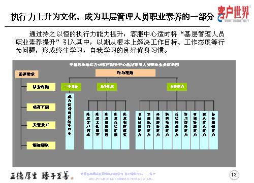 在執(zhí)行力上升文化的同時,基層管理者的職業(yè)素養(yǎng)是我們時刻去追求的,所以客服中心適時地將基層管理人員的職業(yè)素養(yǎng)引入到其中,以期從根本上解決工作目標(biāo)、工作態(tài)度等問題,形成終生學(xué)習(xí),自我學(xué)習(xí)的良好修身習(xí)慣。這是我們客服中心基層管理人員職業(yè)素養(yǎng)的一個體系圖,首先從素養(yǎng)要求的四個維度,行為準(zhǔn)則的一、五、九來展現(xiàn)。一個目標(biāo)是成為優(yōu)秀的管理者,五個注重是注重客戶需求、注重工作細(xì)節(jié)、注重團(tuán)隊建設(shè)、注重總結(jié)匯報、注重制度落實。九種能力:目標(biāo)計劃能力,貫徹執(zhí)行能力、分析解決能力、協(xié)調(diào)溝通能力、總結(jié)創(chuàng)新能力、時間管理能力、師人育人能力和標(biāo)桿超越能力。這個一、五、九,讓它彰顯出素養(yǎng)和表現(xiàn)的四個維度,以身作則、培育下屬、關(guān)愛員工和鍛造團(tuán)隊。