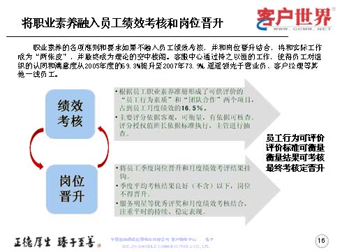 職業(yè)素養(yǎng)不是說在嘴上,講在課上,而是更多地融入到員工的績效考核于崗位晉升當(dāng)中。以解決工作素養(yǎng)要求和實際工作的兩張皮,以及使得客服理念成為理論的空中樓閣。所以我們是持之以恒地開展一線員工組織認(rèn)同滿意度調(diào)查,我們每年都會做一線客服人員的滿意度調(diào)查,在滿意度調(diào)查當(dāng)中,從05年的69.3%,提升到07年的73.9%,而且遙遙領(lǐng)先于營業(yè)員和客服經(jīng)理。而在績效考核中主要把員工行為素質(zhì)、團(tuán)隊合作占到了員工月度績效的16.5%,使大家認(rèn)識到作為一個組織中的一員,作為團(tuán)隊我們是為了一個共同的目標(biāo),彼此依賴、彼此信任,同時也要強(qiáng)化績效來管理。所以主要的評分依據(jù)是客觀、可衡量、有依據(jù)可查,同時也把這些也作為客服人員季度晉升和月度績效考評掛鉤,如果該員工季度的平均考核在良好以下的話,將得不到晉升,最終實現(xiàn)的是員工行為可評價,評價標(biāo)準(zhǔn)可衡量,衡量結(jié)果可考核,最終考核定晉升。