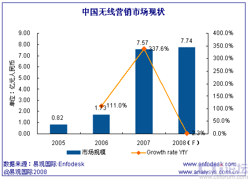 易觀國際(Analysys International)研究發(fā)現(xiàn),中國無線營銷市場經(jīng)過2007年的高速發(fā)展后,2008年已經(jīng)進(jìn)入了商業(yè)模式探索階段,從市場規(guī)模上看,2008年全年無線營銷市場規(guī)模僅比上年增長2.3%。易觀國際(Analysys International)認(rèn)為,無線營銷市場增速的明顯放緩主要由于短信廣告市場的萎縮,短信廣告是無線營銷市場最大的細(xì)分領(lǐng)域,2007年曾經(jīng)占整個(gè)無線營銷市場規(guī)模的72.7%。