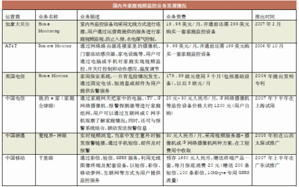雖然數(shù)字家庭的全面實(shí)現(xiàn)還需要相當(dāng)漫長的過程,但是安防報(bào)警、視頻監(jiān)控技術(shù)將會最先在數(shù)字家庭中得到應(yīng)用。目前國內(nèi)家庭監(jiān)控市場還處于起步階段,然而3G的高帶寬將開辟家庭視頻監(jiān)控新時(shí)代,并將催生出巨大的市場商機(jī)。