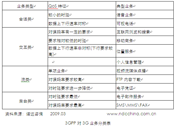 3GPP作為3G標(biāo)準(zhǔn)的研究組織,根據(jù)業(yè)務(wù)內(nèi)在技術(shù)要求把3G業(yè)務(wù)分成四類,主要包括會話類業(yè)務(wù)、交互類業(yè)務(wù)、流類業(yè)務(wù)、后臺類業(yè)務(wù)。此種劃分方法主要關(guān)注的是業(yè)務(wù)的技術(shù)質(zhì)量保證,對業(yè)務(wù)應(yīng)用、業(yè)務(wù)場景、業(yè)務(wù)對生活的影響關(guān)注較少,但這種分類可以清晰的體現(xiàn)業(yè)務(wù)最底層的技術(shù)要求及業(yè)務(wù)與網(wǎng)絡(luò)相互影響。